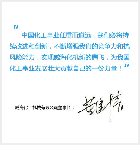 作为国内专业的搅拌反应釜生产基地,我们必将坚持自我约束、自我完善,争做行业的榜样和先锋。中国化工事业任重而道远,我们必将持续改进和创新,不断增强我们的竞争力和抗风险能力,实现威海化机新的腾飞,为我国化工事业发展壮大贡献自己的一份力量!